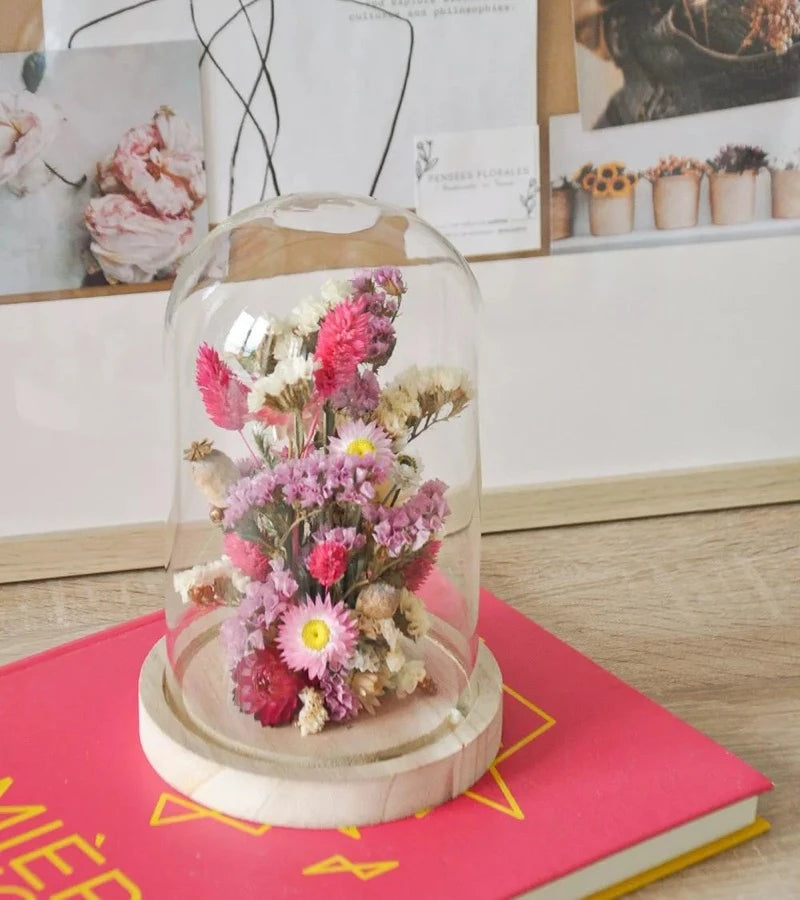 C’est une composition de fleurs séchées présentée sous une cloche en verre, pensée pour décorer durablement sans entretien.