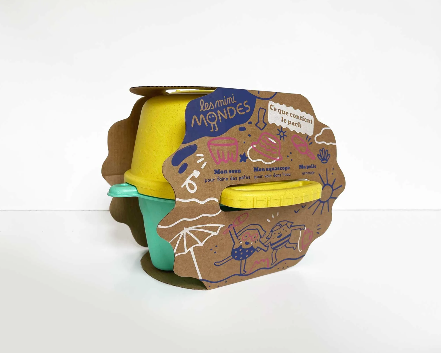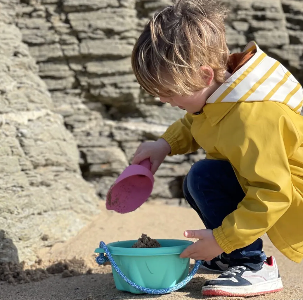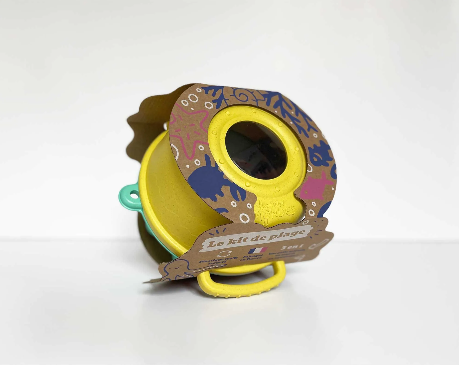 Un aquascope, une pelle qui fait arrosoir, un seau avec des moulures et un cordon de transport.