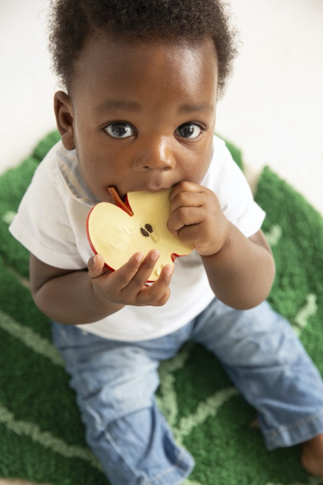 De latex d’hévéa 100 % naturel, peint à la main avec des colorants alimentaires, sans PVC, sans BPA, sans phtalates et sans nitrosamines.