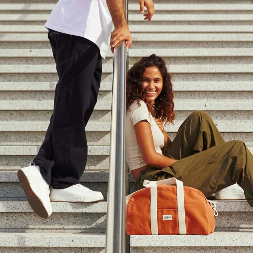 De toile de coton bio épaisse (500 g/m²) certifiée GOTS, avec doublure blockprint et fermeture éclair solide.